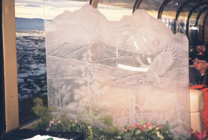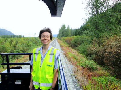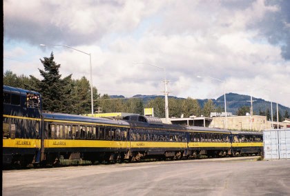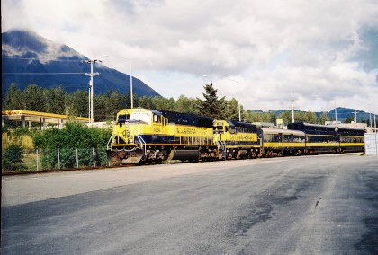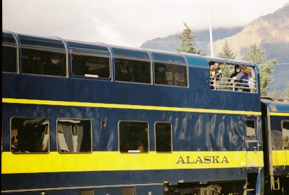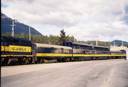 The day started early and after breakast, the car hosts gathered for the daily safety briefing led by Bart Jennings, then we all walked through the train to become familiar with the equipment since the consist was quite different than the previous days. Not only were the Gold Star cars part of today's train but also the Alaska Railroad's business car "Aurora" was to bring up the markers. I had been approached a couple of days before with an offer that I will never forget - to be one of two car hosts in the "Aurora", a passenger car with huge windows, seats just 30 and has a large rear platform. I was absolutely delighted to be asked and of course accepted on the spot.