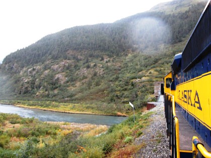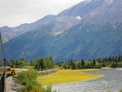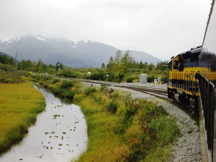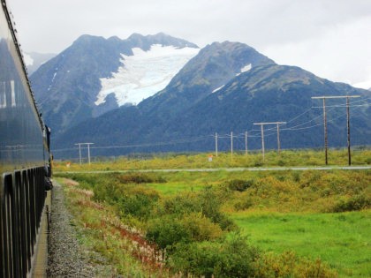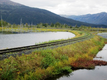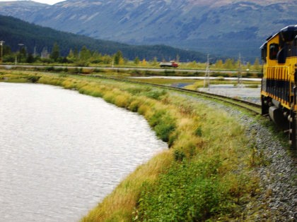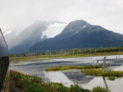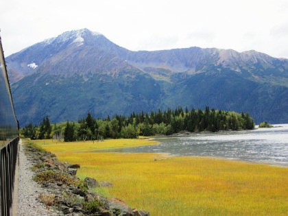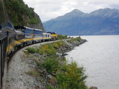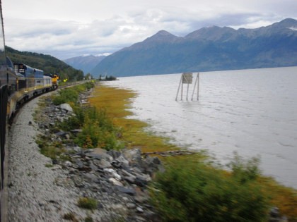 Our train curving around Turnagain Arm on its way to Whittier.