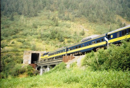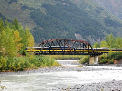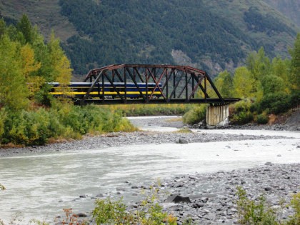 The Alaska Railroad Blues Train on the Placer River Bridge. Everyone returned to the boarding area.