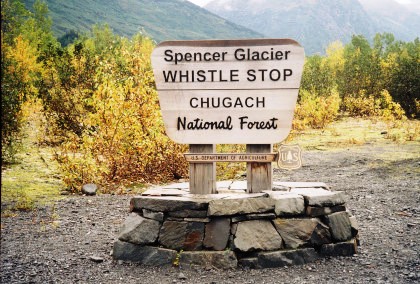 The Spencer Glacier Whistle Stop in the Chugach National Forest sign. Spencer was named after a former railroad employee. We stopped here for a runby and walked down the trail to the bridge over the Placer River.