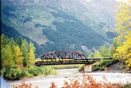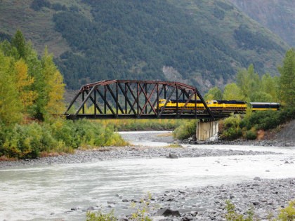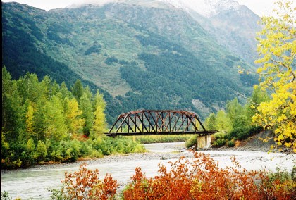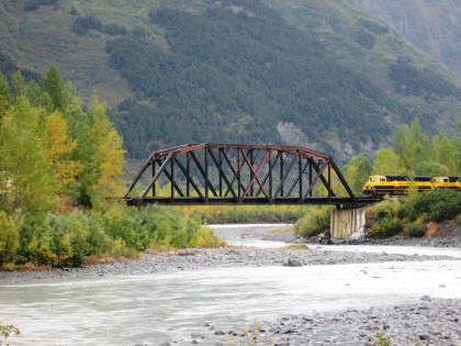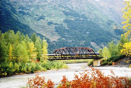 The 200 foot through truss bridge at MP 54.1, Placer River. The river drains Spencer Lake which was created by Spencer Glacier.
