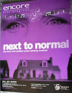 In 2011, Brian Yorkey and Tom Kitt's musical "Next to Normal" played the 5th Avenue Theatre. This show had had its start at the Village Theatre in Issaquah so was coming back to home territory. This was a different and rather dark show that did not really appeal to me.