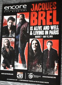 "Jacques Brel Is Alive and Well and Living In Paris", the revue about the Belgian singer, composer, actor and director was the 5th Avenue and ACT's show for 2015. This revue, which I only knew of by name, was very well done and some of the songs familiar.