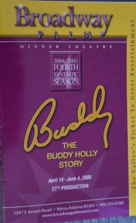 A Memorial Day weekend trip to Arizona to Washington in May 2005 saw us at the Broadway Palm Dinner Theatre in Mesa to see Alan Janes' 1989 musical "Buddy", the story of Buddy Holly.