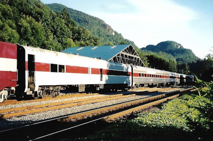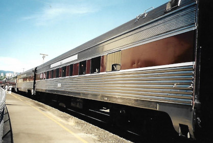 Introduced in 1997, the Pacific Starlight Dinner train offered dome and regular seating to patrons over the 25.8 mile trip from North Vancouver to Porteau Cove from May to October. This service ran until the end of 2002. It was our first time on a dinner train and the atmosphere and scenery were excellent. My notes are rather sparse though and while I know I had the salmon as my entree, the salad and dessert offerings and my choices are unknown. I photographed most of the consist at North Vancouver before boarding.