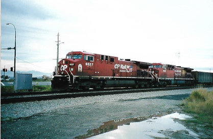 On November 14th, 1999, Canadian Pacific AC4400CW 9527 and 9682 were at Gulf Road ready to enter the Roberts Bank facility.