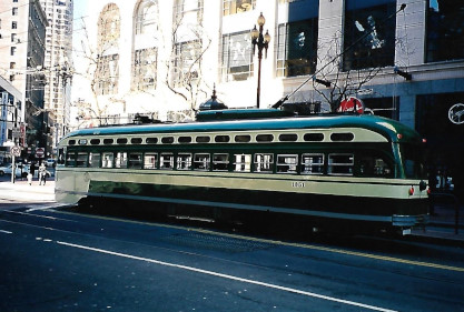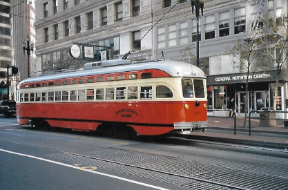 South East Pennsylvania Transportation Authority (SEPTA) PCC car 1051 (nee Philadelphia Transporation Company 2123) in San Francisco Municipal Railway (1960) livery. Built 1948.