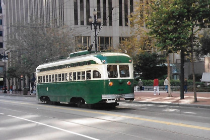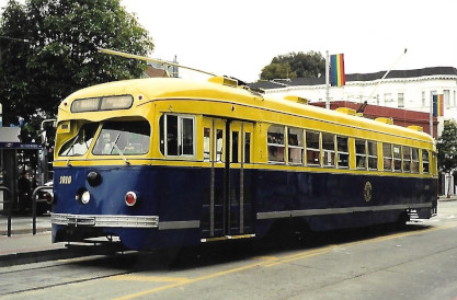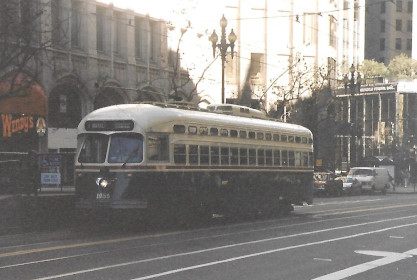 The efforts of our organization and its members have helped Muni acquire more than 20 historic transit vehicles. Our volunteers have actively helped restore about fifteen vintage vehicles, including streetcars, cable cars, trolley coaches, and motor coaches. While we have essentially completed that mission, our volunteers continue to help keep the streetcars of the F-line sparkling by cleaning them on the line every day. We also document the history of vintage street railway operation in San Francisco through our quarterly newsletter, Inside Track, and through our website and its blog, our social media presence, including two Facebook groups, Twitter and Instagram feeds and a Flickr photography group.South East Pennsylvania Transportation Authority (SEPTA) PCC car 1059 (nee Philadelphia Transportation Company 2099) in Boston Elevated Railway livery. Built 1948.