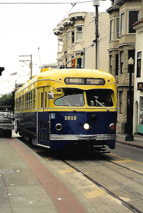 San Francisco Municipal Railway PCC car 1010 in the blue and yellow MUNI livery. Built 1948.