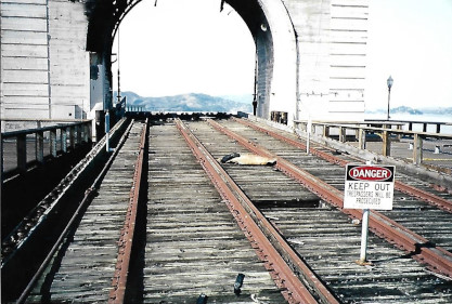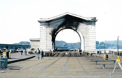 The remnants of a former San Francisco Belt Railroad arch bridge that was used for loading materials on barge at Fisherman's Wharf after a 1998 fire.