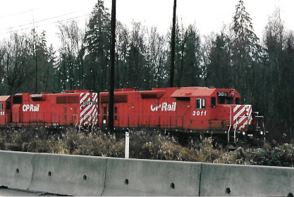 On January 25th, 2004, Canadian Pacific transfer freight led by CPR GP38AC 3011 and 3002 were at MP 2 of the Fraser Valley Sub. This was about one mile from Trapp Yard. Photograph by Bob Alkire.