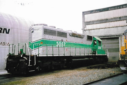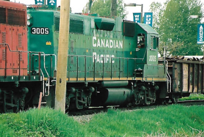 Canadian Pacific GP38AC 3005 spent a few years in this two-tone green after being re-lettered for E&N Railfreight (an internal shortline which operated on Vancouver Island starting in 1996). It was returned to 'Canadian Pacific' in 2000, and was at the entrance to Trapp Yard on April 30th , 2006. Photograph by Bob Alkire.