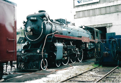 As part of its rebuild and return to service in 2001, Canadian Pacific 4-6-2 2816 visited Trapp Yard for some work. Here it is on April 20th, 2002, photographed by the late Michael Coles.