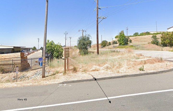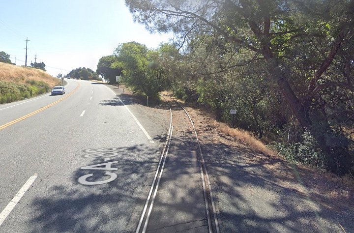 8.-9. Just east of Sunnybrook, the line crosses Hwy 88/104 at grade for a second time. Image 8 looks toward Martell. Image 9 looks toward Ione. (both images are Google Streetview)