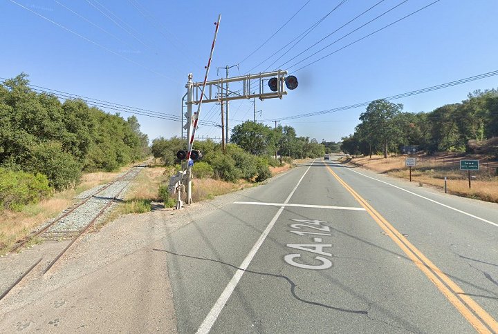 3.-4. Google street views of the Hwy 124 grade crossing at Ione city limits. In image 3 the line begins its climb towards Martell.