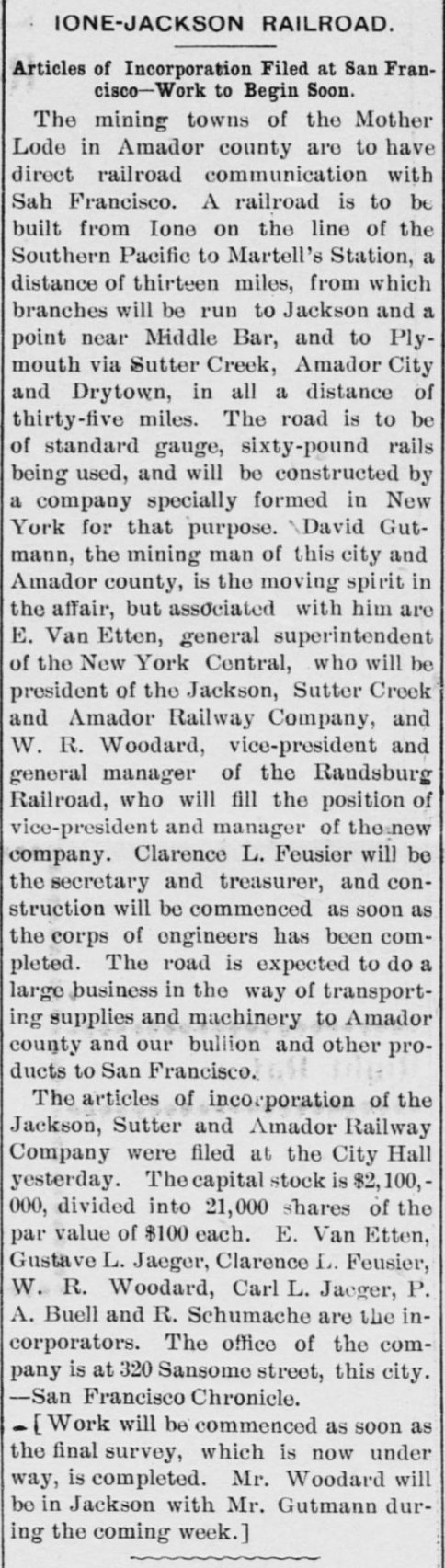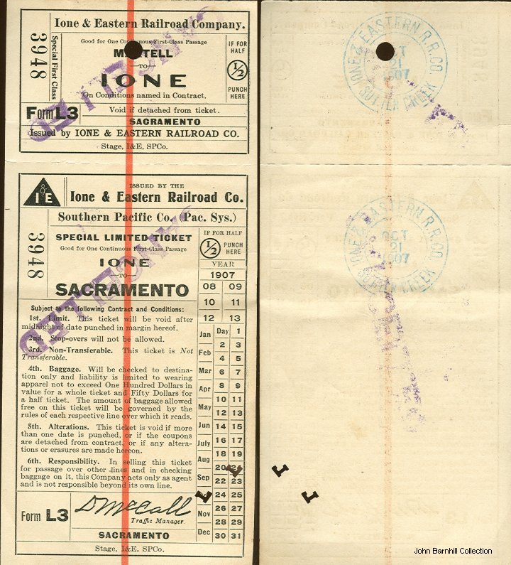 2. Ione & Eastern ticket stamped in Sutter Creek in 1907. Note the "L" shaped punches. (John Barnhill Collection)