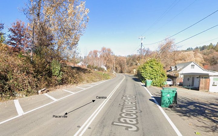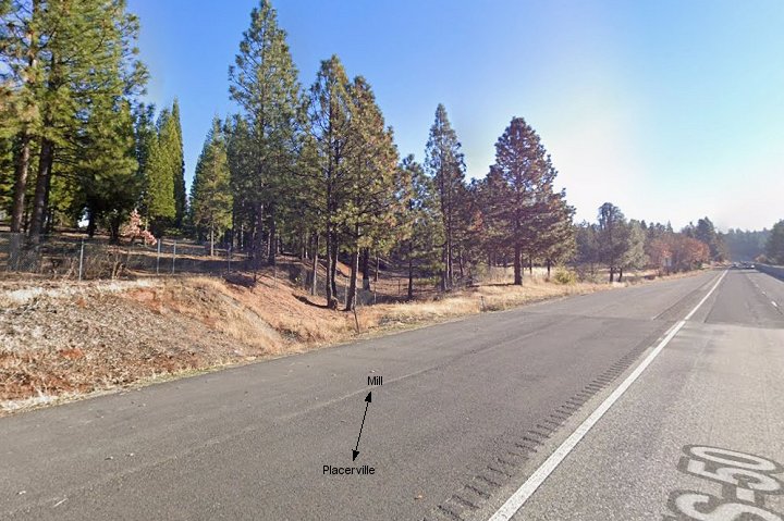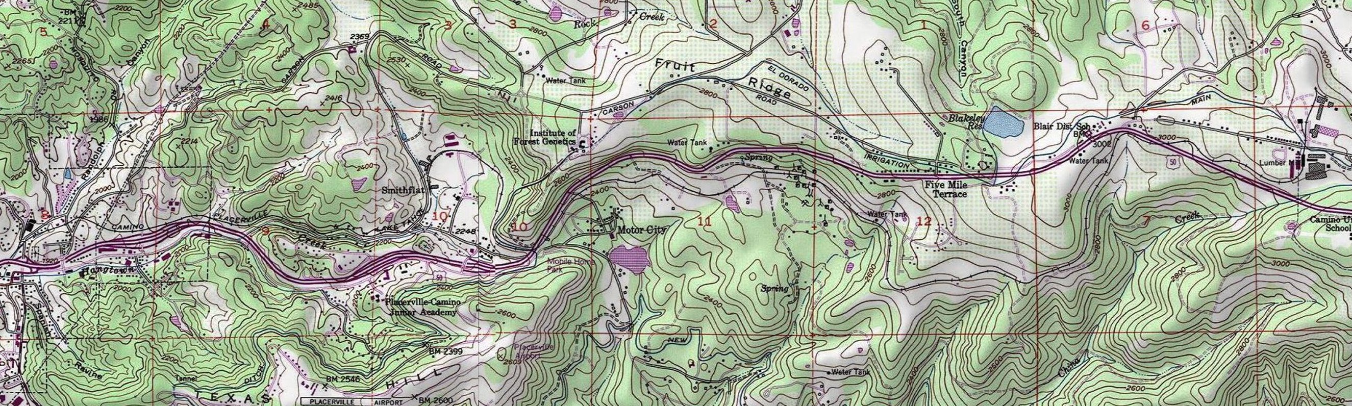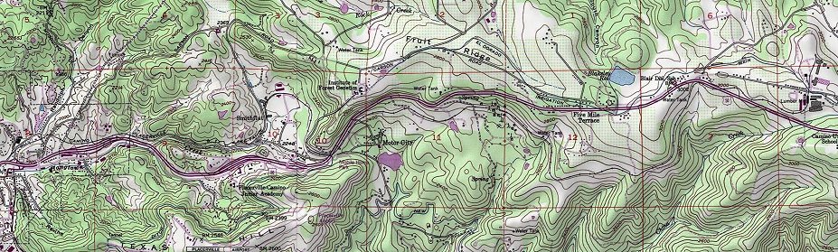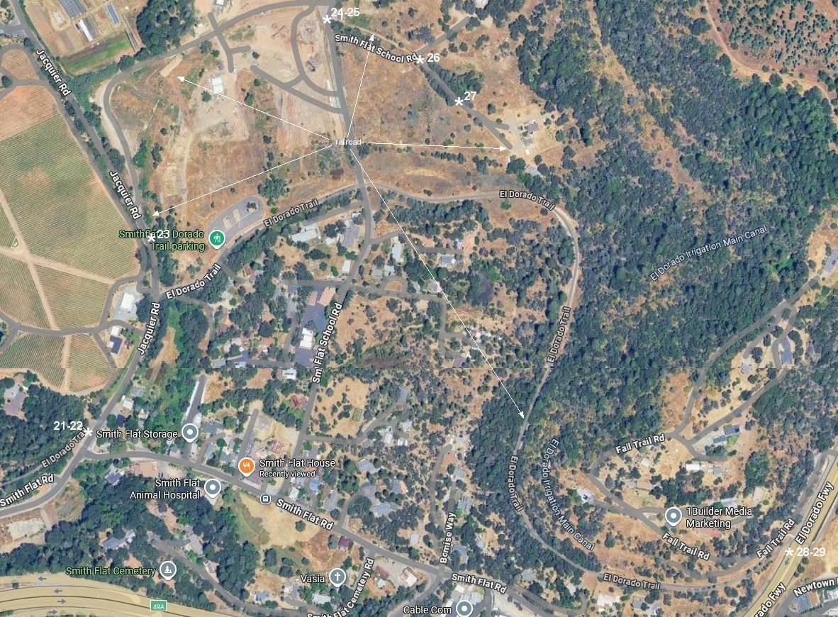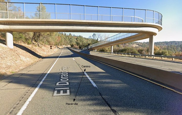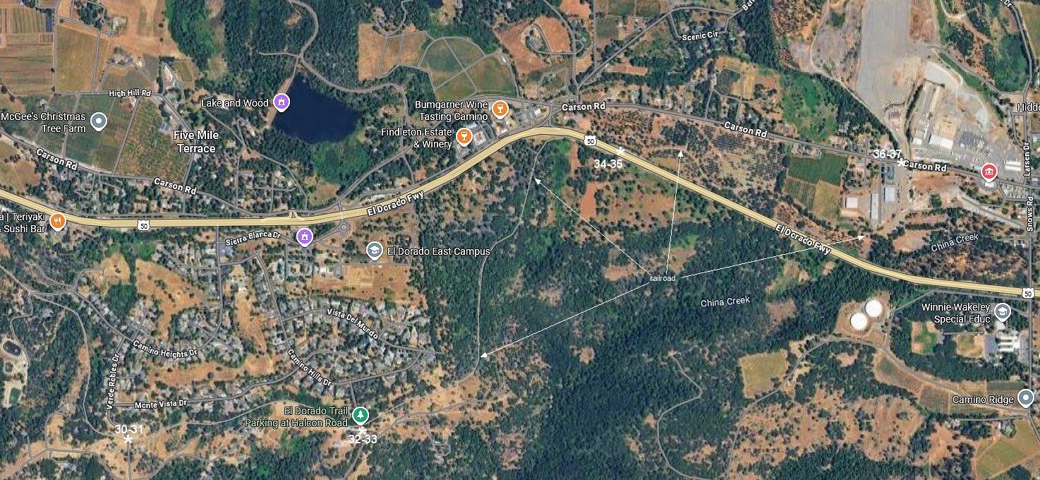 28.-29. The line once crossed Hwy 50 at grade here. The El Dorado Trail now uses an overpass in these Google street views.