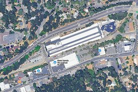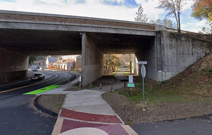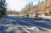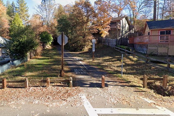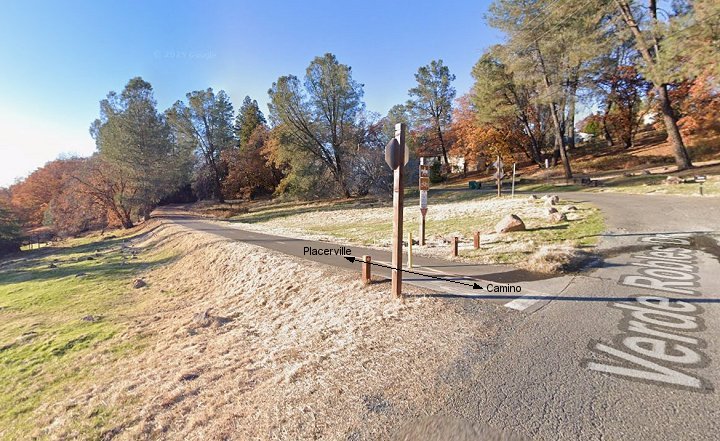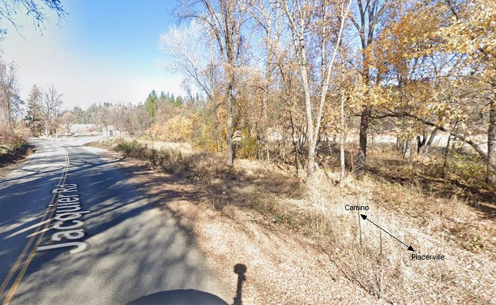 1.-2. West and east Google street views at Locust Ave. This was once a small yard. The Southern Pacific and Camino Placerville & Lake Tahoe RR interchanged trains here.