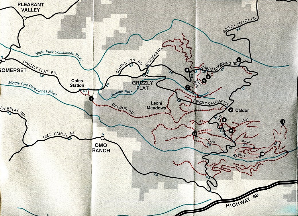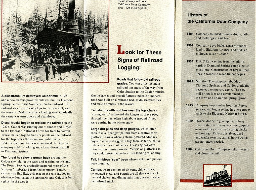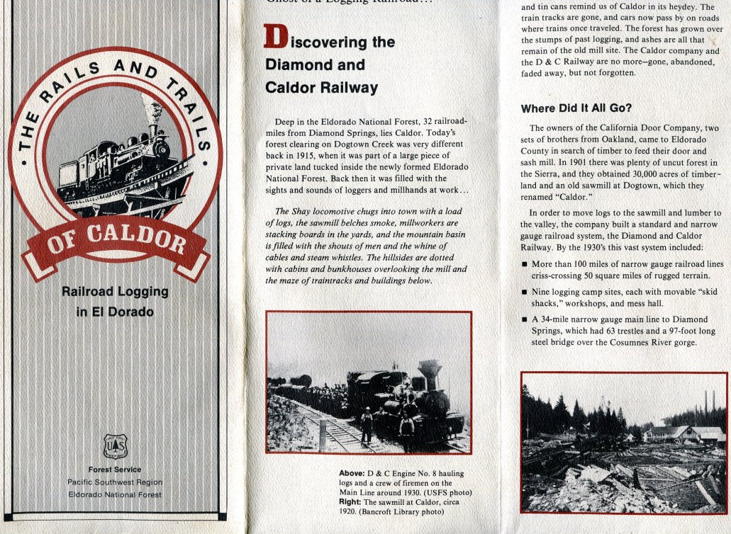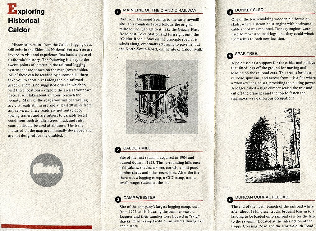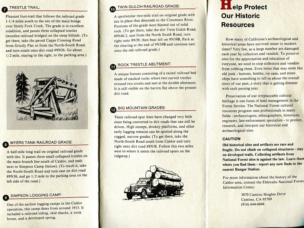 The USFS Placerville Ranger District in Camino,CA provides a self guided tour brochere for the Diamond and Caldor. This brochure includes a history overview, line history timetable and map. The map has twelve numbered points of interest and a key is provided to give a description of and directions to each point of interest. Contact info: Phone: 530-644-2324 Address: 4260 Eight Mile Rd. Camino,CA 95709 |