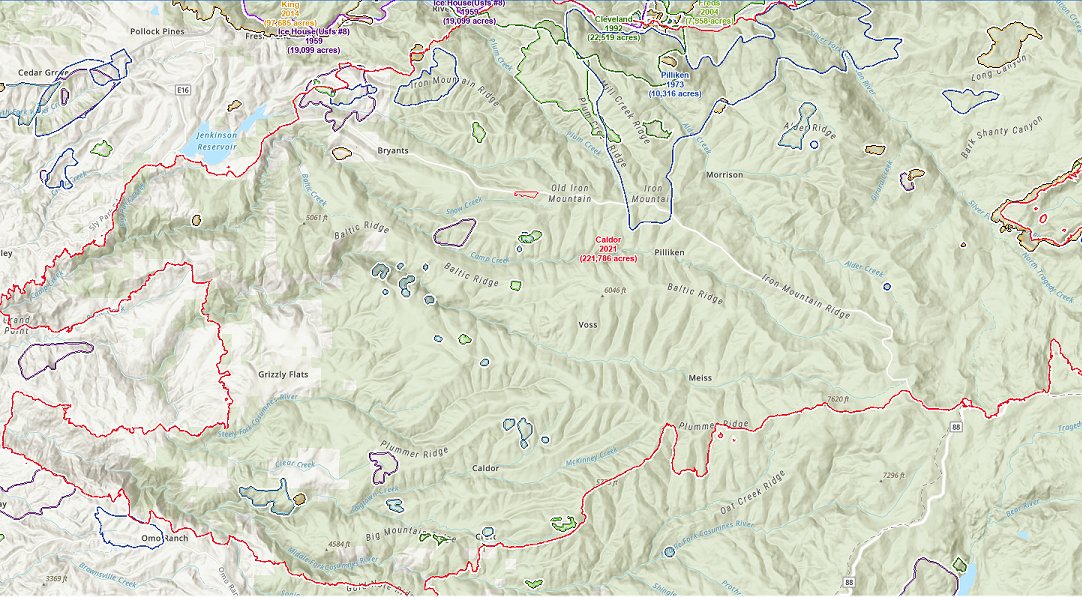 August through October of 2021 saw the Caldor fire burn much of the timberland once logged by the California Door Company. This included the old mill site at Caldor itself along with most of the area previously covered by the logging railroad. Click here for a map of the fire.