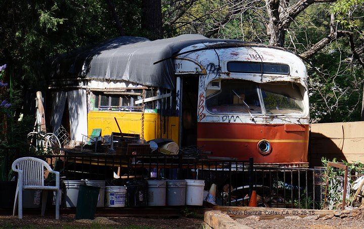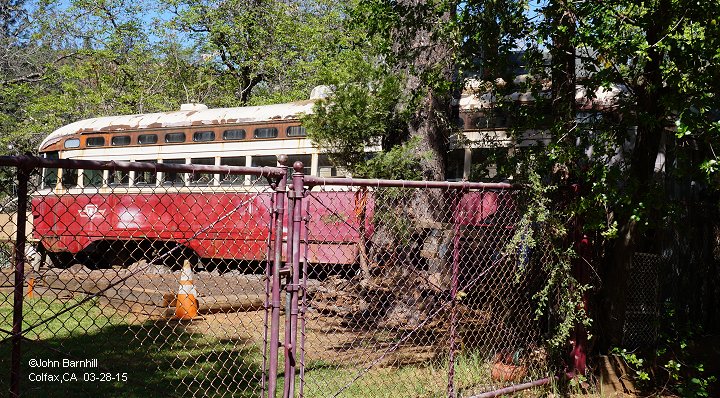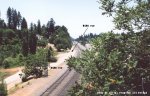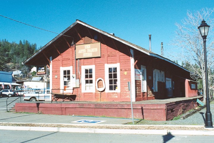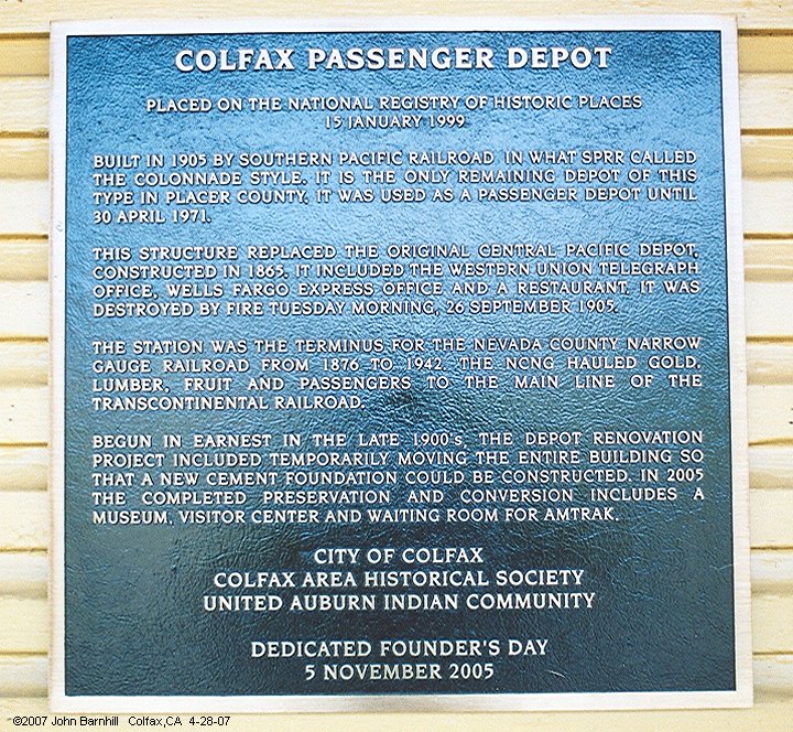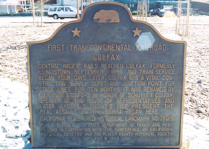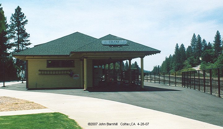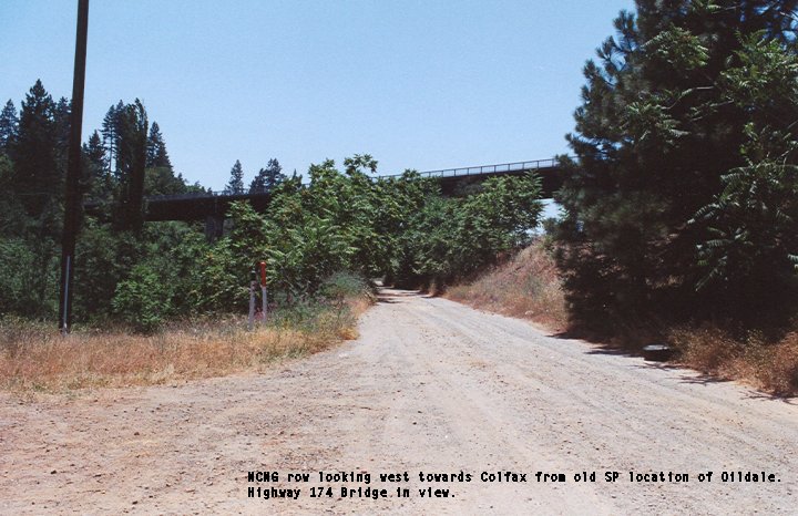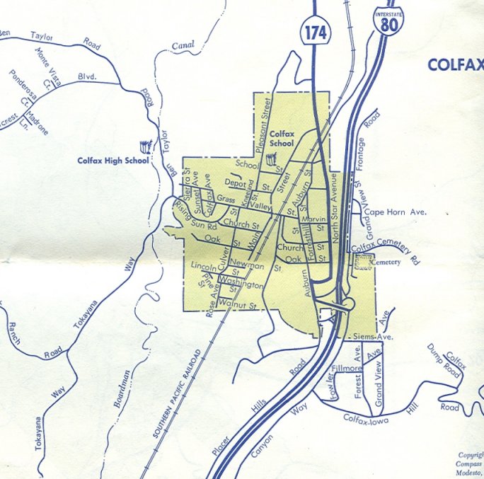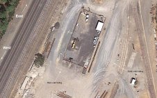 Southern Pacific once based helper locomotives in Colfax and built a seven stall enginehouse near the wye to service them. Only two footings for the walls remain.