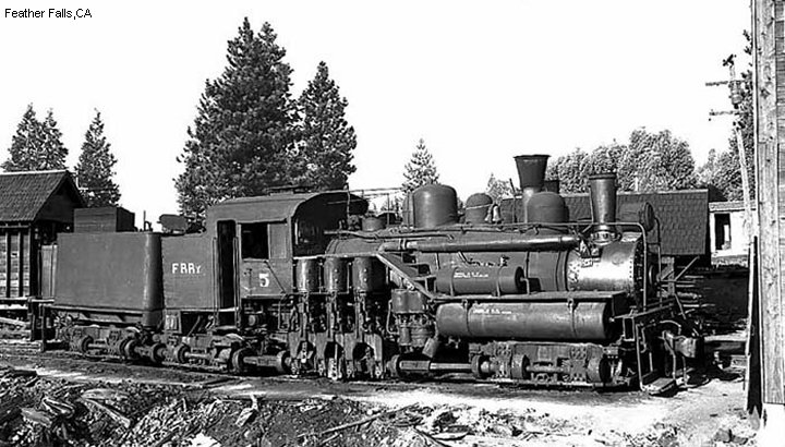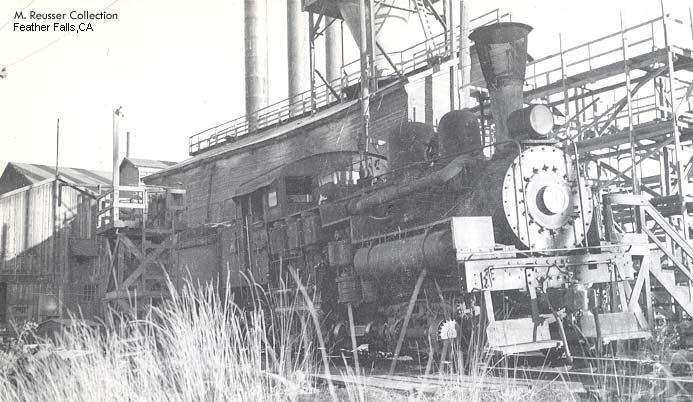Built in 1922 under the name Hutchinson Lumber Co, originally this logging line ran from the woods at Mooretown, later called Feather Falls, to a connection on the Western Pacific at Bidwell (now underwater). The Western Pacific hauled the logs from this point to the mill in Oroville, a distance of about seven miles. The company became Feather River Pine Mills in 1927 and soon thereafter a fire burned down the Oroville plant. Several years later in 1938 a new mill was built at Feather Falls. At this time the railroad became the common carrier, Feather River Railway with the logging lines from the mill eastward into the timber still being carried under the name of Feather River Pine Mills. Georgia Pacific eventually bought the entire operation. 1966 saw the end of the trains, mainly due to the building of the Oroville dam.