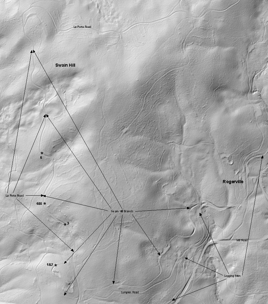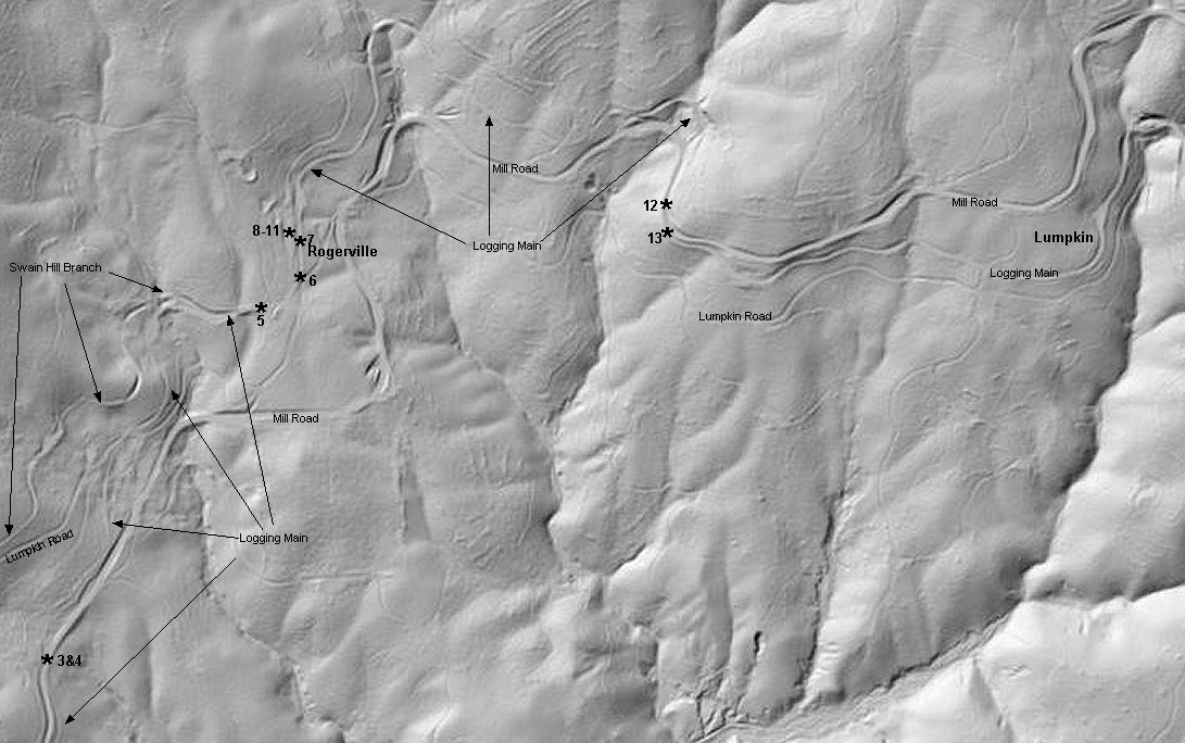 The Swain Hill branch leaves the main near Rogerville and heads back west before turning northward near the intersection of Lumpkin Road and