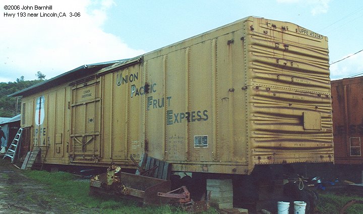 2.& 3. UPFE reefers #452115 and 452145 privately owned at a fruit ranch along Hwy 193 between Lincoln,CA and Newcastle,CA.