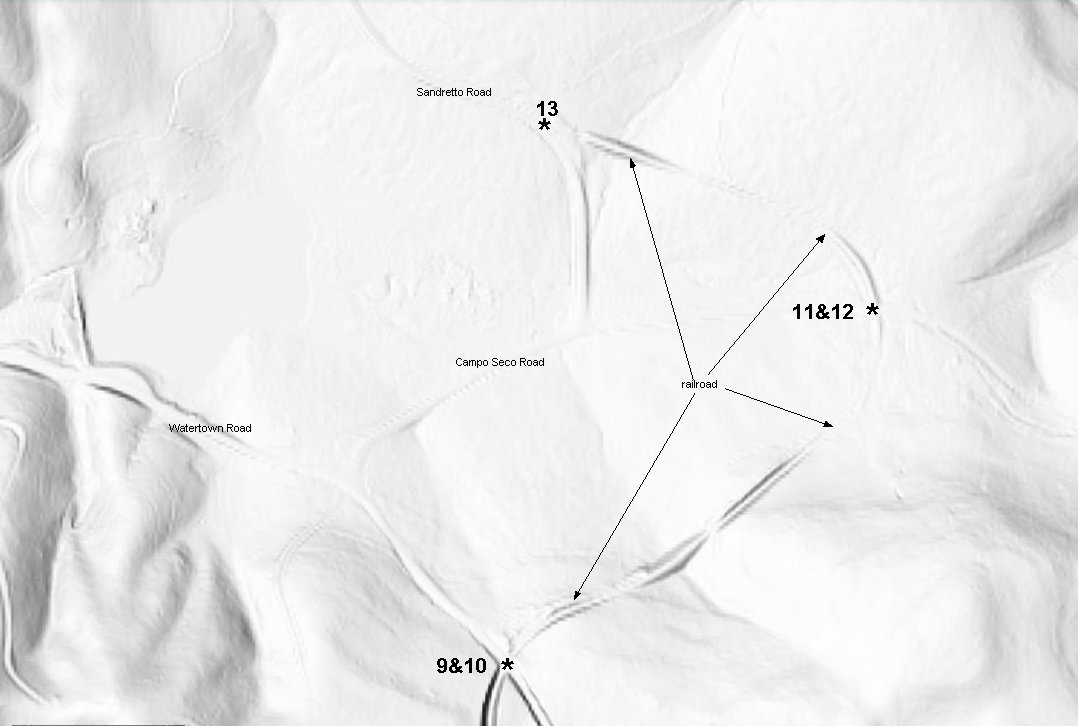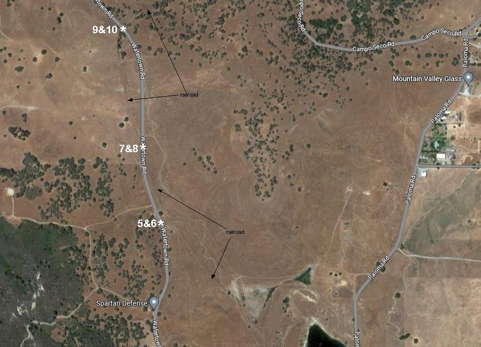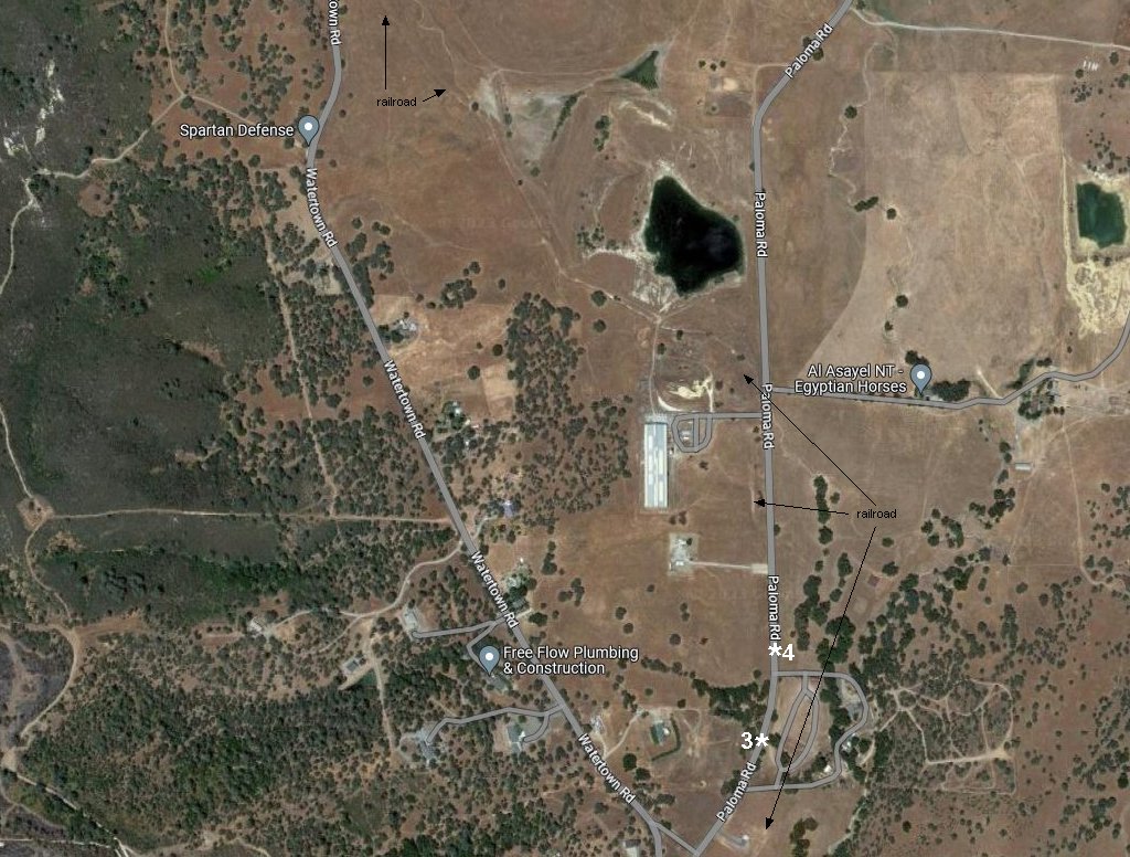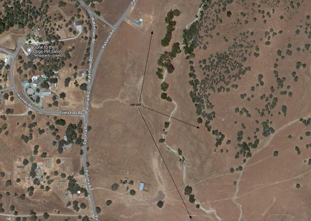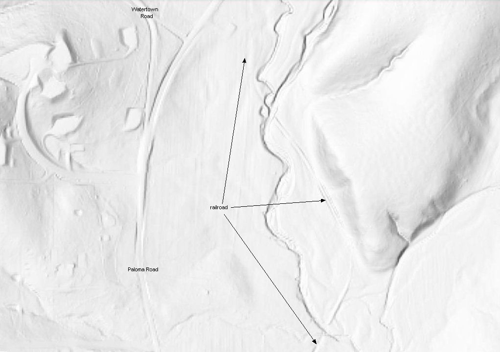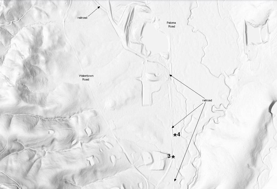 3.-4. The line approaches, crosses, and parallels Paloma Road. Shortly the railroad turns slightly left towards Watertown road.