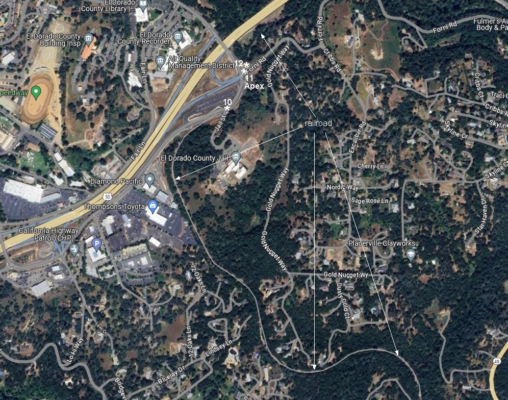 11.-12. West and east Google street views at Locust Ave. This was once a small yard. The SP and Camino Placerville & Lake Tahoe RR interchanged trains here. See the fire insurance map below too.