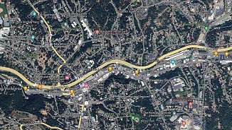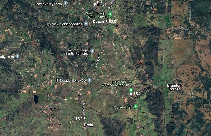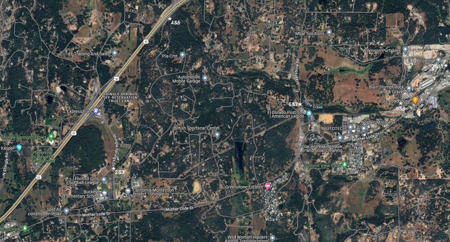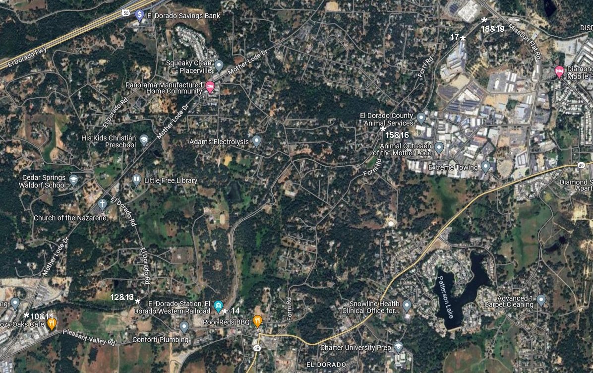 18.-19. Google satellite and USGS lidar views of Placerville marked with the locations of above images.