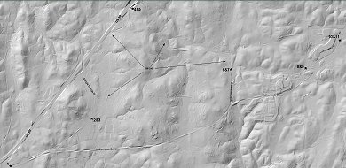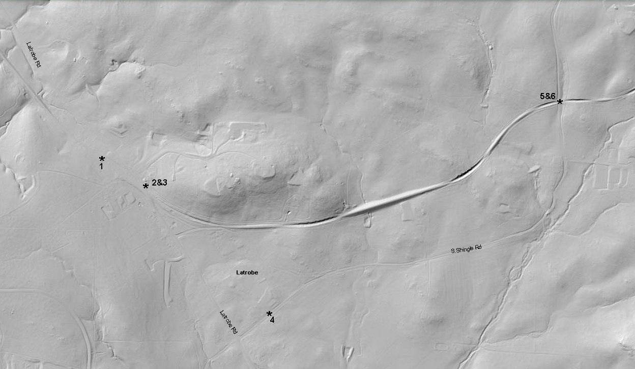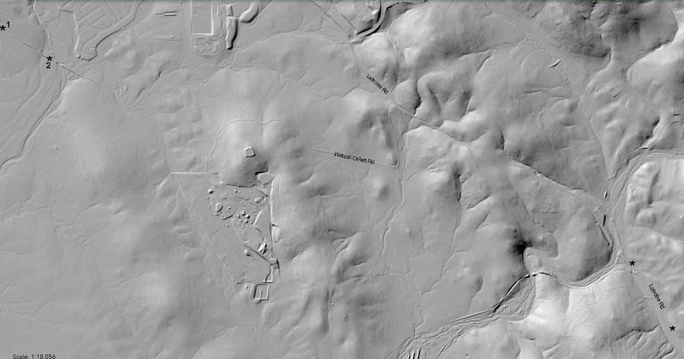 1. The mound on the right appears to be where the Latrobe depot stood. Further confirmation is needed.