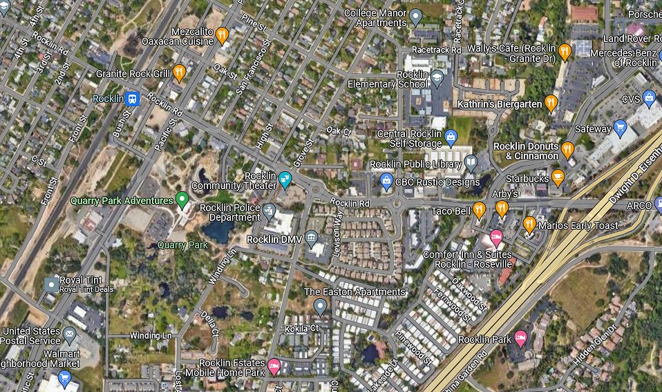 (Note: construction of the Quarry Park in 2018 and 2019 has destroyed most everything bordered by Rocklin Road, Pacific, Winding Wy and S. Grove St.)
