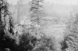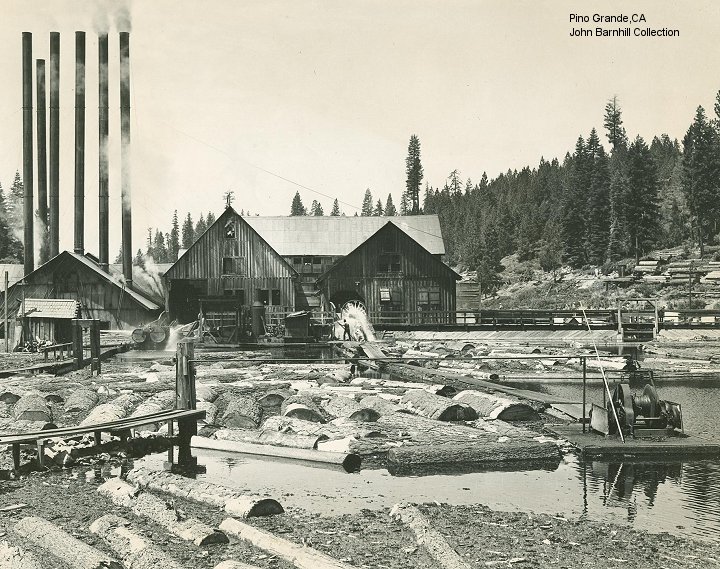2. Looking across the log pond at Pino Grande. Note the spray jets to clean the logs. (John Barnhill Collection)