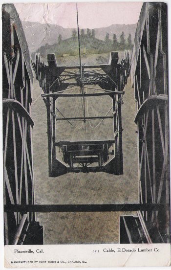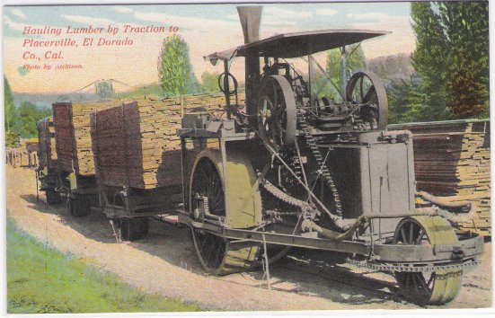 11. This postcard view depicts the steam tractors used to haul lumber to Placerville from the Camino mill before a railroad was built. (Beth Squiers Collection)