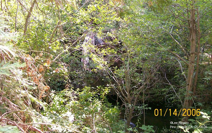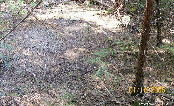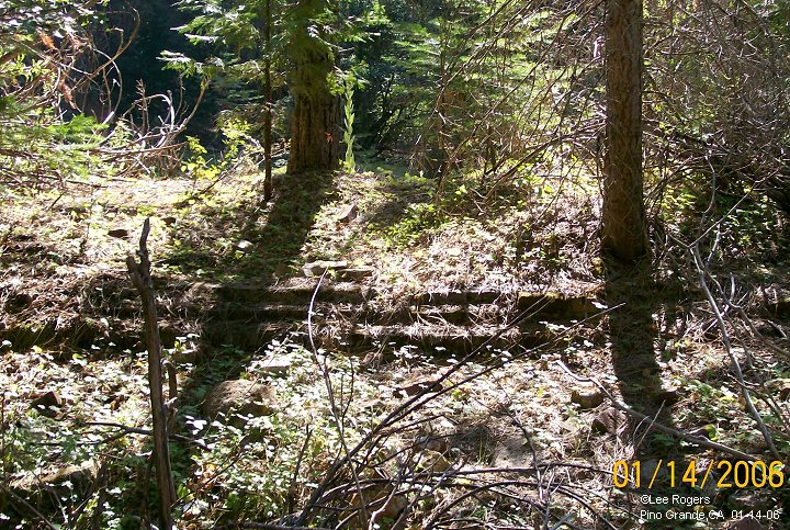 Pino Grande was originally a lumber camp of the American River Land & Lumber Co. Logs were transported from here to a point high above the South Fork of the American River by narrow guage railroad to a log chute. From there they were floated down the river to a mill in Folsom.