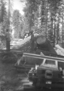 This summer I worked on the landing. We took the logs, that the cats dragged in, and we hoisted them onto the cars. Two us worked at the track, Melvin Lorraine (the camp boss's son, and in charge of the landing) and myself. Two other men unhooked the logs from the cats and using the rigging from the donkey to the spar pole, hooked the logs, which would then be hoisted onto the car. Melvin and I would then unhook the logs, balance the load and secure it.