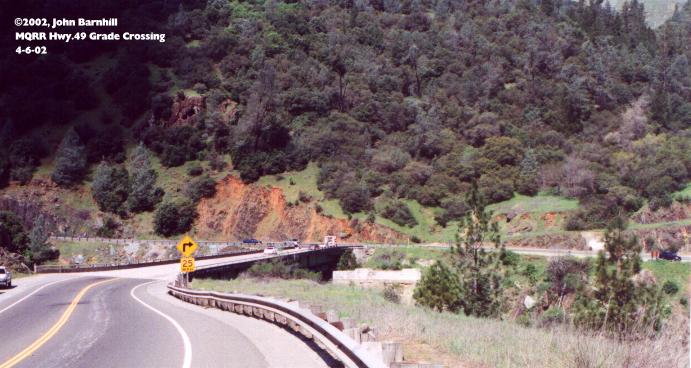 The line crossed Highway 49 at this location. To the left, upgrade, out of picture is a nice cut that leads to Trestle 17 and No Hands Bridge. To the right out of picture, much of the railroad grade and the highway were wiped out by a giant landslide in the 1980s.