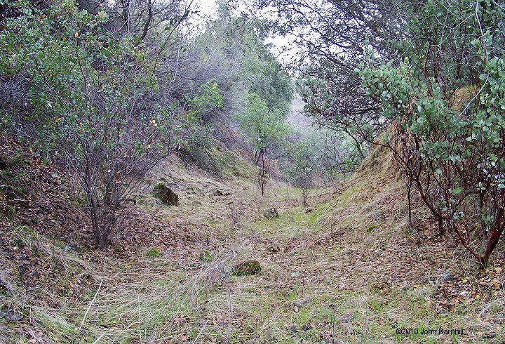 Trestle 5 stood lower in the same gully as trestle 1. This view looks "upgrade" from one of the many roads put in during dam construction. Only the upper abutment and half of the piers still exist. In the opposite direction, only a short portion of the roadbed still exists, below, before construction once again completely obliterates any remains including the site of trestle 6.
