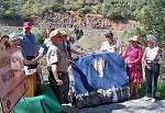 Unveiling of plaque, Mike Lynch, Auburn SRA Supt., reads the wording to the crowd. L-R: Neil Moore (Western States Endurance Run Foundation), Mike Lynch, Kris Payne (President, El Dorado County Historical Society), Hal Hall (President, Placer County Historical Foundation & Western States Trail Foundation), Jerry Pozo (MQRR Anniversary Committee & Native Sons of the Golden West), Dave Allen (Native Sons of the Golden West), Jennifer Montgomery (Placer County Supervisor), Donna Howell (Placer County Historical Foundation) and Rodi Lee (historian, author and chief writer of the landmark application).