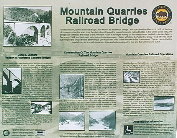 Just so no one will go away with questions unanswered on the landmark, the state Parks Department has added an interpretive sign that details everything from the bridge's pioneering use of reinforced concrete to the three lives lost during bridge construction, to its use today as the final American River crossing of the Western States 100-mile endurance run and Tevis Cup 100-mile ride.