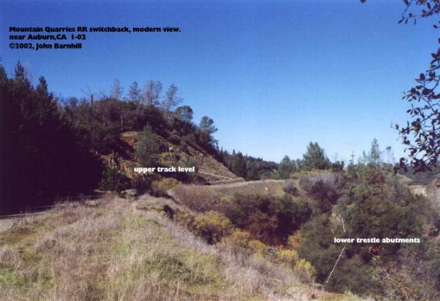 The Mountain Quarries had a switchback just out of view behind me in this image. The upper trestle, number three, has been completely filled and paved. Upon close scrutiny, a small portion of the upper abutment and a pier or two can be found. Both abutments for Trestle 4 still exist. From here to Trestle five, the entire roadbed has been wiped off the face of the earth.