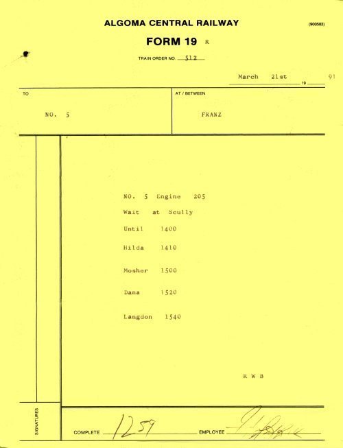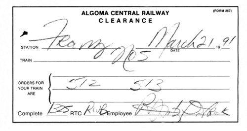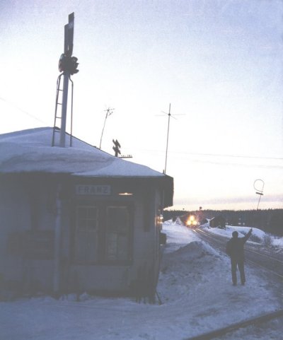 trainman. Gary Montgomery and Ted Ellis came for a short period of time in the 1980's. Brad Pantilla from Hawk Jct, stayed the longest on the ACR Swing. He was a younger chap that liked the bush life and later went dispatching at the Soo. Perry Wilson and Marlene Tomas were probably the last two on the swing job before they cut it off in 1987. Jim O'Leary used to relieve me for the holidays from 1986 to 1991. His brother Jack (J.A.) O'Leary was the agent at Franz when I first started with the ACR in 1967. George Allan used to work day day shift then, J. R. (Woody) Woodruff was on 4 to 12 and Charlie Sykes was the 12 to 8am man. They had the train order signal there then and I think they stopped using it about 1973 or 1974, as it used to be left on all the time and the CP deactivated it after they got everyone used to the C.T.C. CPR dispatchers at the time were George Lengyl (GTL), Bud Alward (WAA) Yvan Beauparlant (YB), Bill Mitchell (WCM), Woody Woodruff (JRW), John Slobodian (JMS) and Ed McLeod (EDM) along with a host of relief people. The ARC dispatchers at the time were Mac Bain (MCB), Allan Wilson (ASW), Rod Montgomery (RDM), Rod McCall (RJM), George Scott (GDS), Robert Bain (RWB), Brad Pantilla (BJR) and Perry Wilson (PFW) |