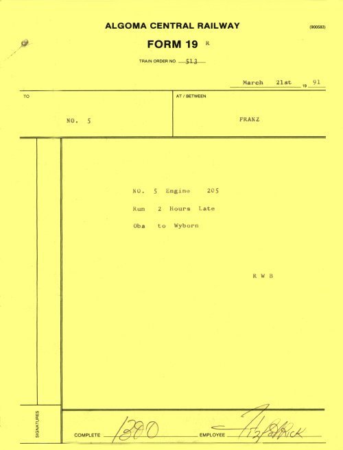 | I enjoyed my fifteen years at Franz. I had several chances to go dispatching on both AC and CP, but got too comfortable being my own boss there working day shift. (Most of the time!) I qualified in 1991, but never worked a shift to establish my seniority on the list. I trained with MCB and RJM at the Soo before I went to Franz. |
