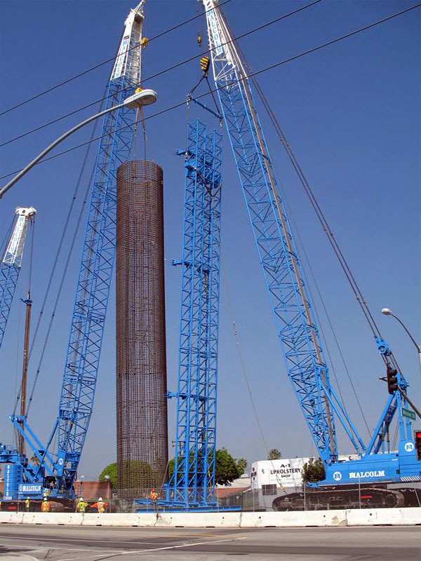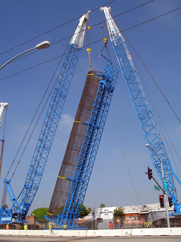 10/15/09 Two cranes lowered this giant rebar cage 15 feet in diameter and 108 feet long into the second column footing hole, west of Wesley.