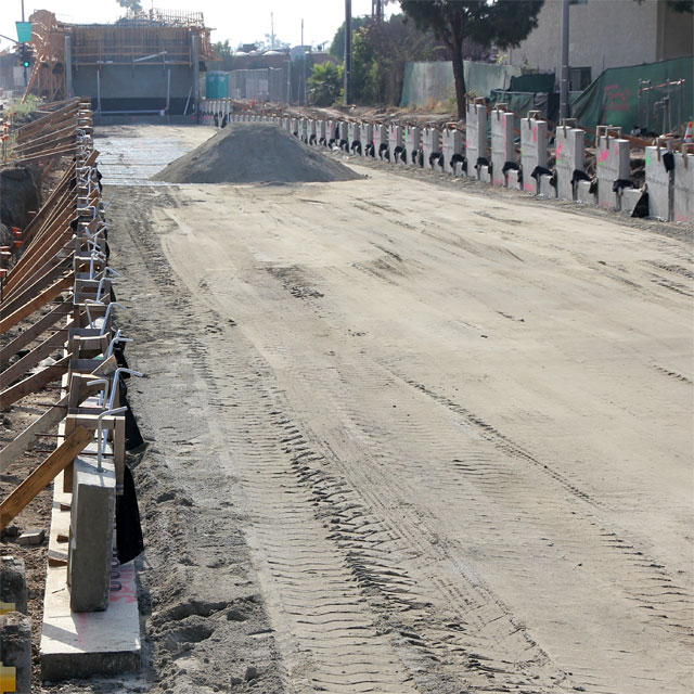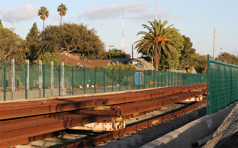 11/21/10 — Looking west (above) and east (below) from National and Wesley in Culver City. Note the soundwall posts, the green fencing, and the rail ribbons for the Culver City aerial.