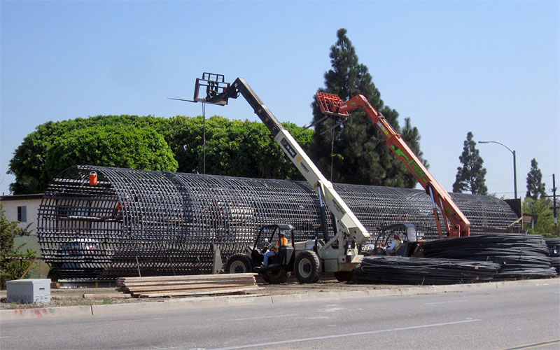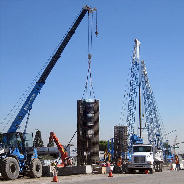 9/18/09 A rebar cage for the first Culver City bridge footing at Wesley is being assembled (above). Compare how deep the drilling rig has gone (below) with its 8/16/09 full-height photo farther down. This step is stabilizing the sandy soil before it the hole can be bored.
