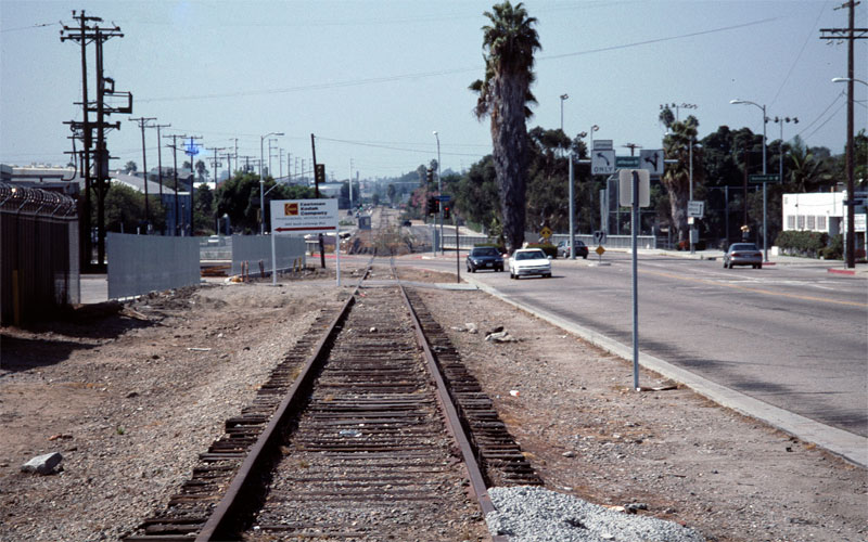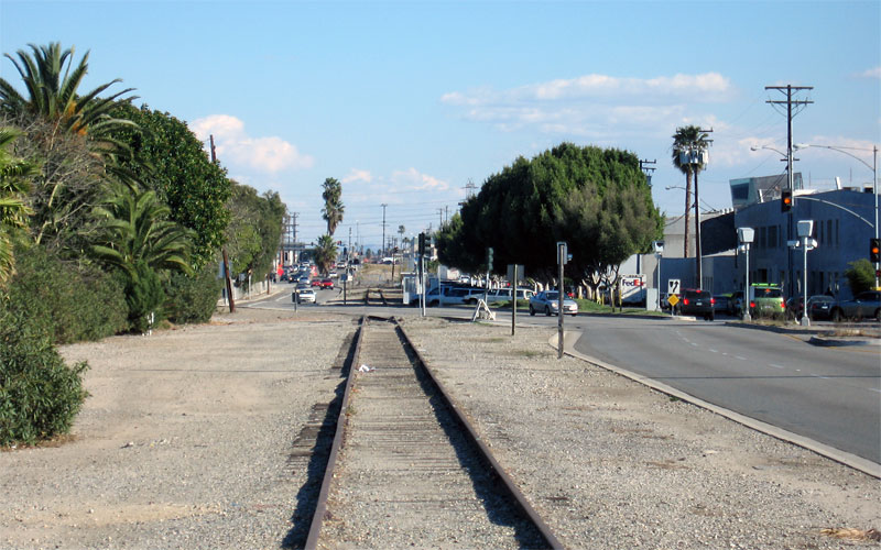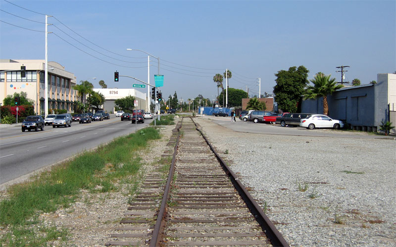 1/12/07 Looking east toward Ballona Creek, the old track crosses the westbound lanes of National Blvd. at Hayden Ave. in the near-distance.
