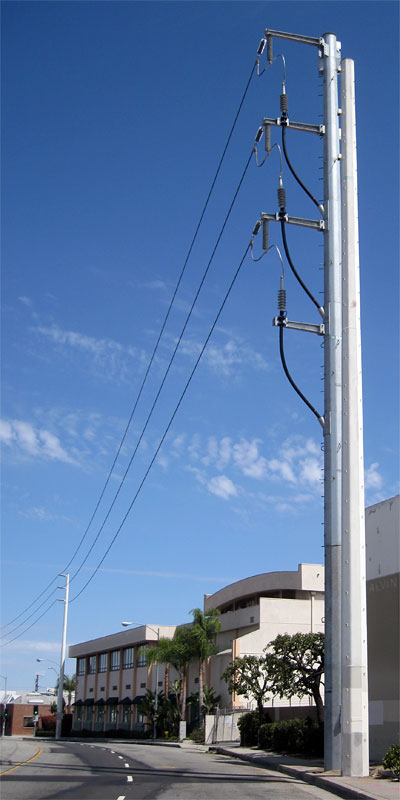 8/4/09 The high-voltage power lines along National Blvd. in Culver City have been cut over to underground. Here is the new pole installed east of Washington to do that. You can see the darker pavement on the street where the new conduit was installed awhile ago. A similar pole takes the wires back up on the south side of Venice Blvd. west of National.