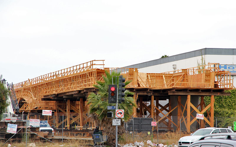 2/11/11 — The junction between the double-track bridge over National and single-track bridges over Washington in Culver City was revealed when this last part of falsework was removed.